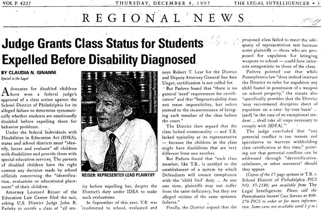 Filed in 1997, T.B. v. School District of Philadelphia was a class-action lawsuit brought by the Education Law Center on behalf of students who were expelled before being evaluated for special education services.