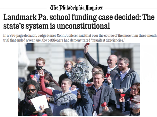 On February 7, 2023, Commonwealth Court Judge Renée Cohn Jubelirer issued a historic ruling that Pennsylvania’s school funding system is unconstitutional. The court recognized that our public schools require adequate funding to meet our constitution’s mandate, and the ruling directed the legislature to develop and implement a plan for bringing the state’s school funding system into constitutional compliance.